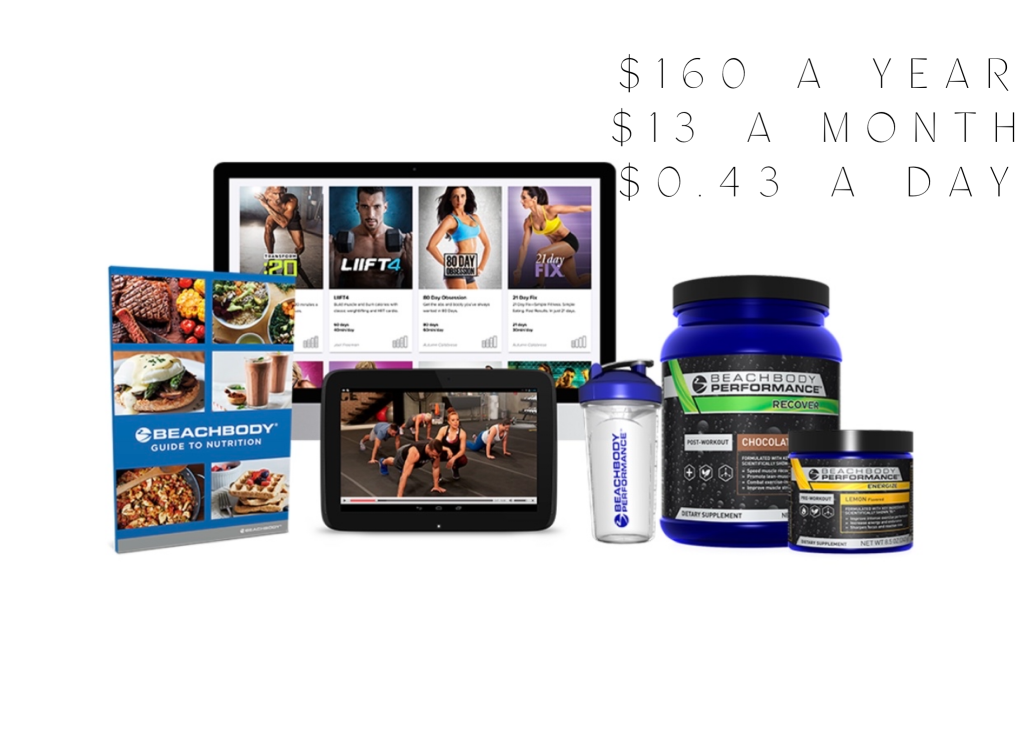 Ok, so here is the deal: ALL packages come with access to BOD {Beachbody On Demand} and it includes ALL past and future release fitness programs. Some of the few examples: p90x, T25, PiYo, Lift4, 100 Morning Meltdown, 21 Day Fix, etc. It is something for every taste and ever fitness level. You will get access to this for 12 months that you can access anytime and use from anywhere.